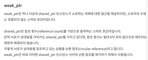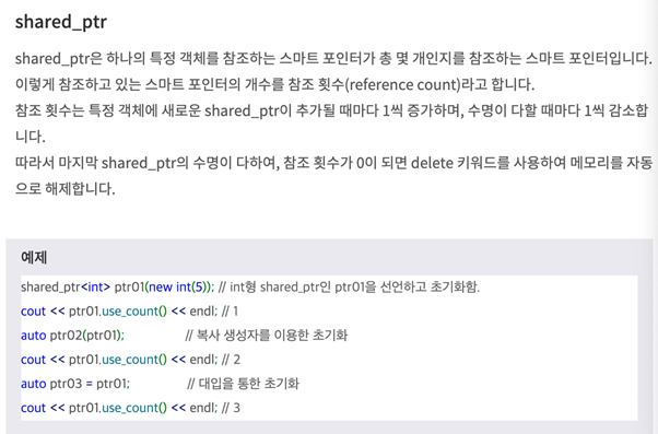 -smart pointer : C++프로그램에서 new 키워드를 사용하여 동적으로 할당받은 메모리는, 반드시 delete 키워드를 사용하여 해제해야 한다. 해제 하지 않은 메모리 누수로부터 프로그램의 안전성을 보장하기 위해 스마트 포인터를 제공한다. 스마트 포인터란 포인터 처럼 동작하는 클래스 템플릿으로 사용이 끝난 메모리를 자동으로 해제해 준다. 스마트 포인터는 new 키워드를 사용해 기본 포인터가 실제 메모리를 가리키도록 초기화한 후에, 기본 포인터를 스마트 포인터에 대입하여 사용한다. 이렇게 정의된 스마트 포인터의 수명이 다하면, 소멸자는 delete 키워드를 사용하여 할당된 메모리를 자동으로 해제한다. 따라서 new 키워드가 반환하는 주소값을 스마트 포인터에 대입하면 따로 메모리를 해제할 필요가 없다. 스마트 포인터의 종류로는 unique_ptr, shared_ptr, weak_ptr 이 있다.