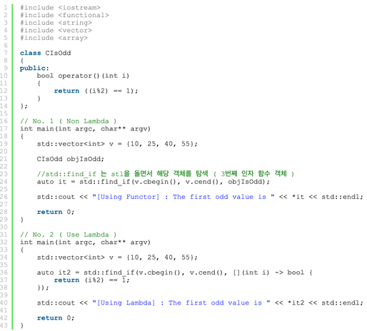 -Lambda expression : 람다는 함수 객체(Function Object of Functor)이란 개념이 연관되어 있다. 이 함수 객체를 좀더 편하게 사용하기 위해 람다표현이 만들어 졌다. 이 함수 객체는 람다와 목적이 동일하면서 이를 한층 업그레이드 한 개념이다. 람다의 장점으로는 코딩이 간편해 진다는 것과 코드의 가독성이 좋아진다는 것이다.