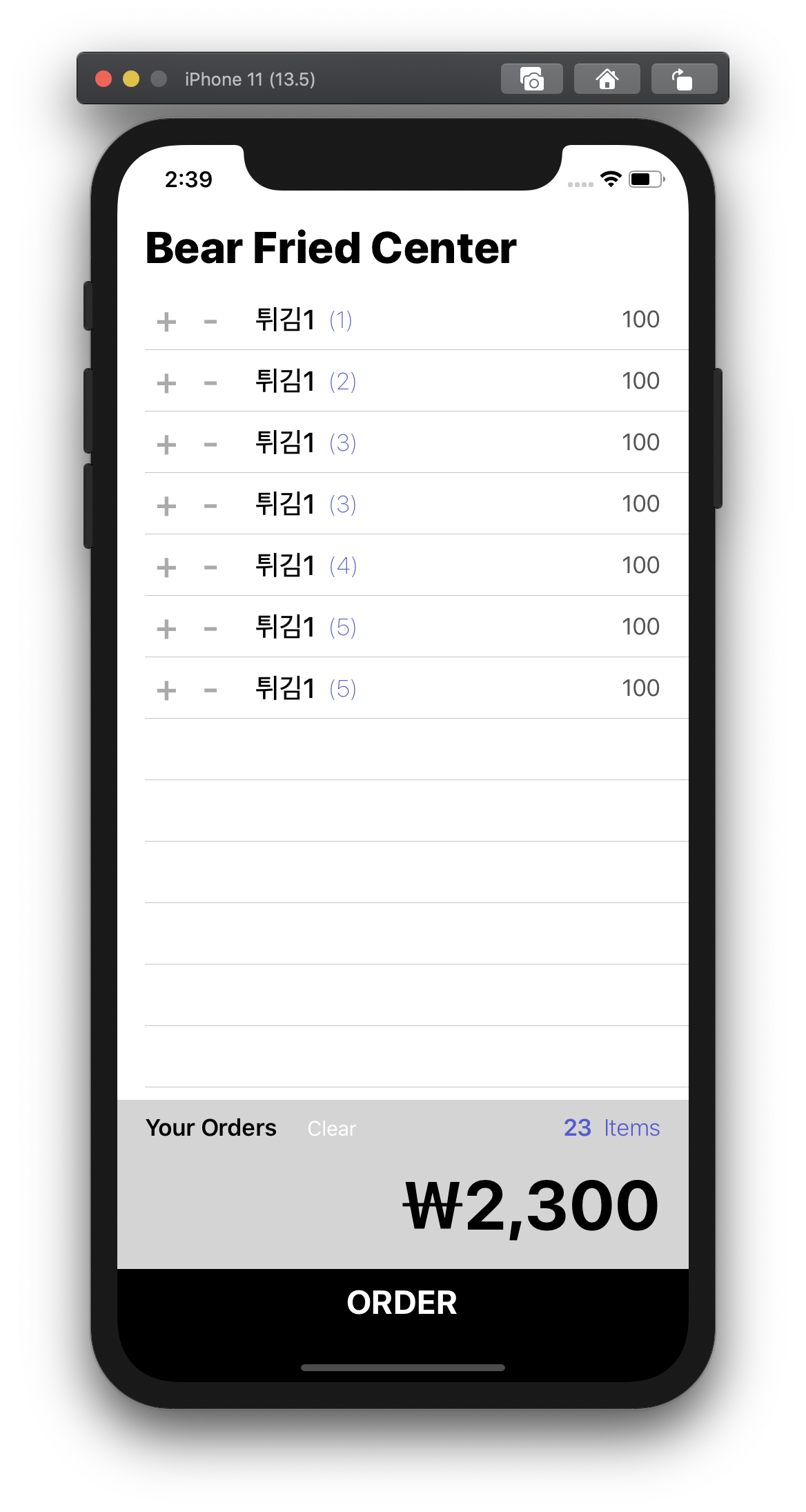 rxcocoa를 사용해서 데이터 소스를 사용안하고 메뉴 배열의 값만 바꿨는데 count, price, tableview 전부 바뀌는 걸 볼 수 있다.