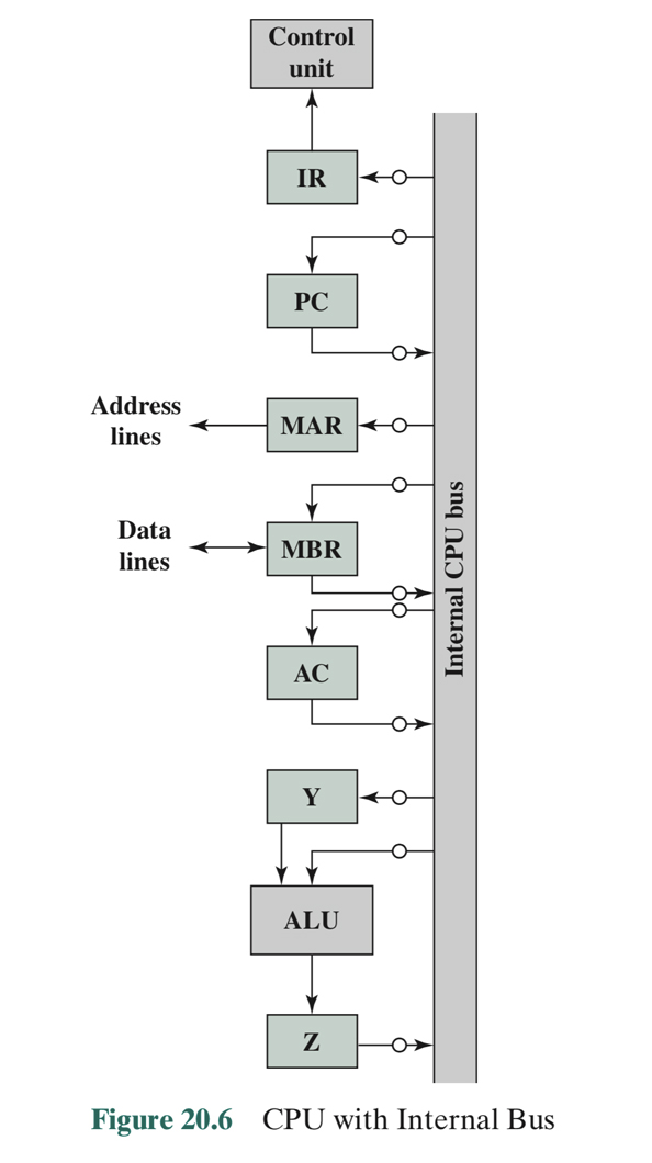 Assume that propagation delay along the bus and through the ALU of Figure 20.6 are 20 and 100ns, respectively. The time required for a register to copy data from the bus in 10ns. What is the time that must be allowed for