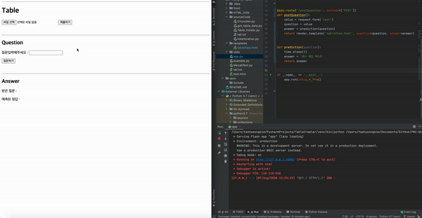 - 해당 질문을 일단 서버로 보내 모델에서 prediction 했다고 가정하고 응답을 웹에 표시한다.