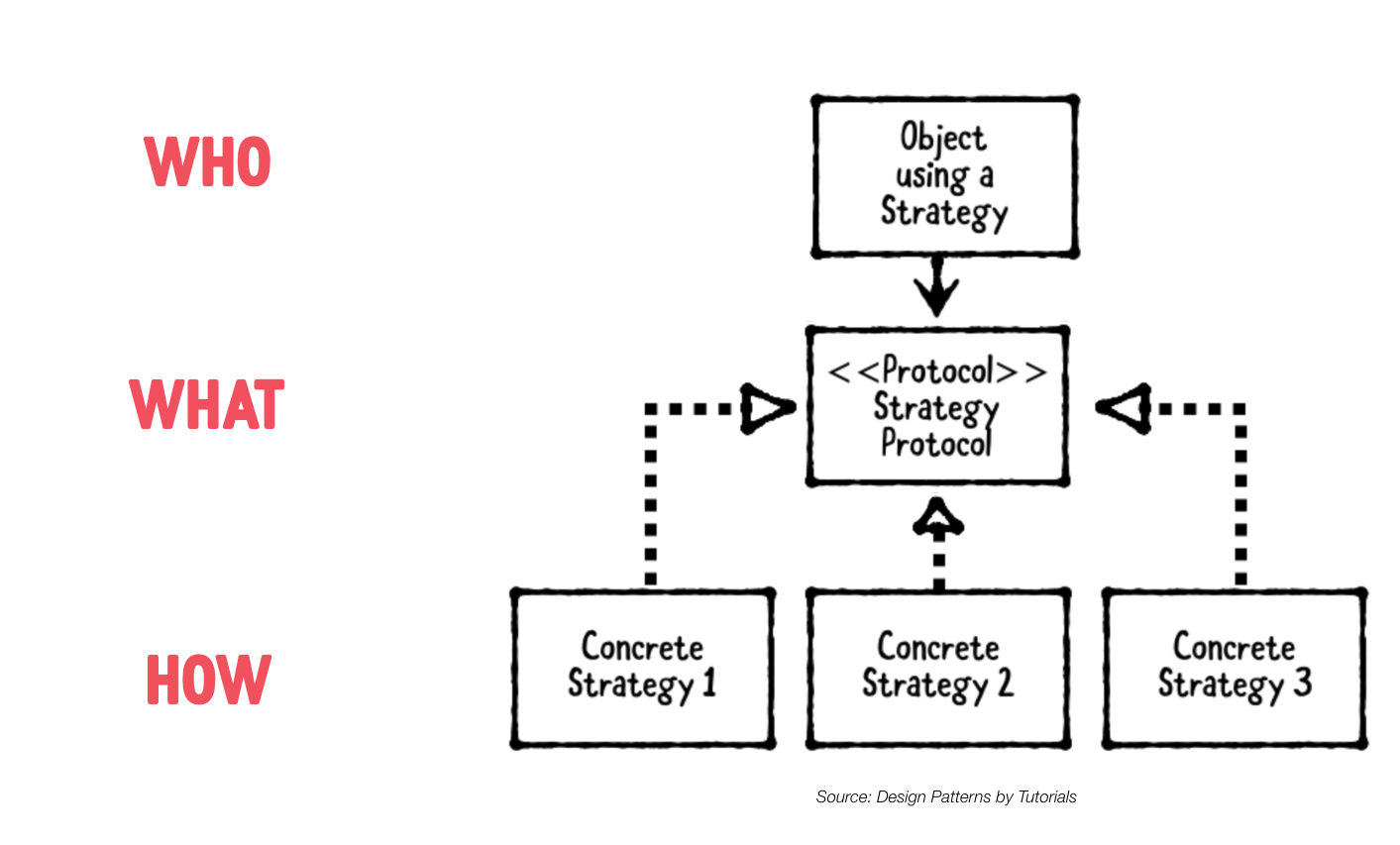 - How (Strategies): strategy protocol 을 준수하는 객체들이다.