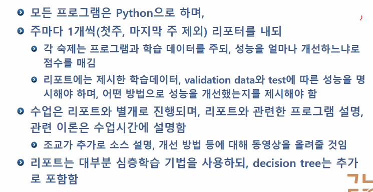 - 레포트 10개 나갈 예정 (프로그램 주고 학습 데이터 다 줄꺼임, 파이썬만 쓸 수 있으면 바로 구현하면 됨)