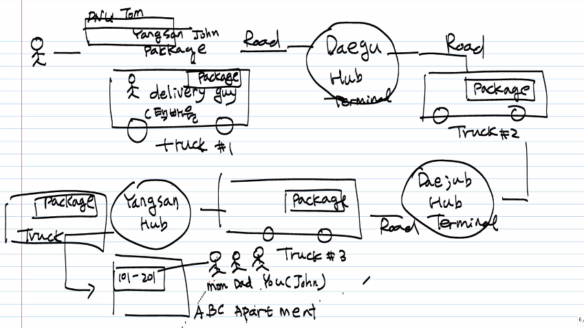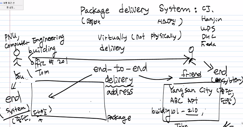- in physical delivery system, we may have road, hub, terminal, your apartment(mom dad you),