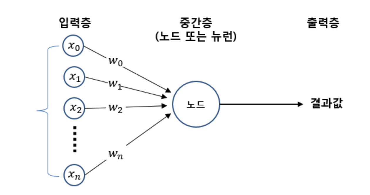 - 단층 퍼셉트론: 중간층이 하나의 노드로 구성되어 중간층과 출력층의 구분이 없는 구조
