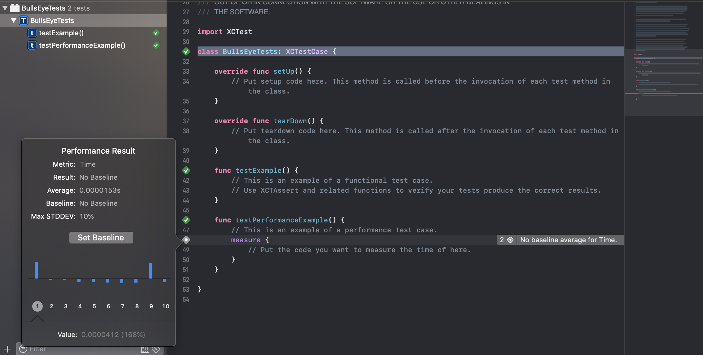모든 테스트가 끝날 경우 testPerformanceExample() 함수에 있는 마지막 회색 다이아몬트 버튼을 통해 성능 결과를 확인해 볼 수 있다.