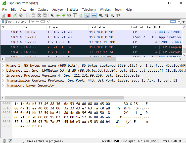 이더넷을 더블 클릭하여 패킷 캡처를 시작한다.