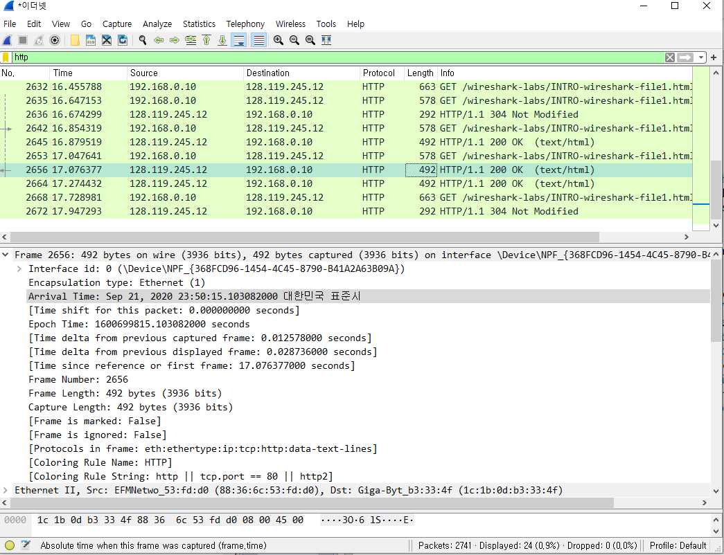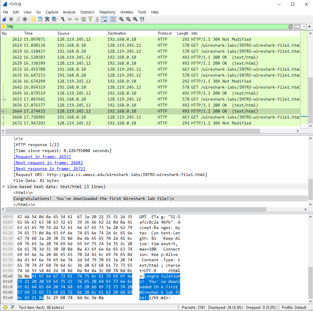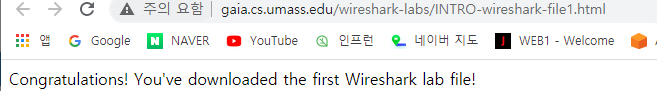 캡처를 하면서 gaia.cs.umass.edu/wireshark-labs/INTRO-wireshark-file1.html 해당 주소로 이동해본다.
