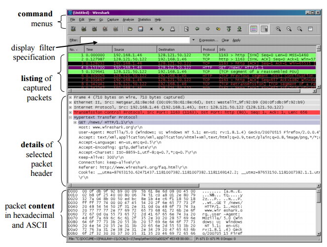 packet analyzer의 경우 프로토콜 메시지 안에 있는 모든 필드의 내용을 보여준다. 그러기 위해서 packet analyzer는 프로토콜에 의해 교환되는 메시지의 구조를 이해하고 있어야 한다. 예를들어 HTTP 프로토콜의 필드를 알기 위해서 packet analyzer는 이더넷 프레임을 이해하고 IP 데이터 그램을 identify할 수 있어야 한다. (그래야 TCP 세그먼트를 IP 데이터 그램에서 추출할 수 있다.) 마지막으로 HTTP 프로토콜에서 예를들어 HTTP 메시지의 첫번째 바이트는 GET, POST, HEAD와 같은 문자열을 가지고 있는걸 아는 것이다.