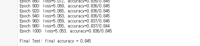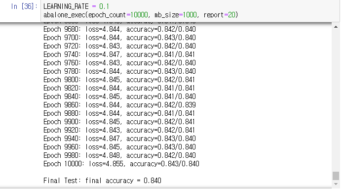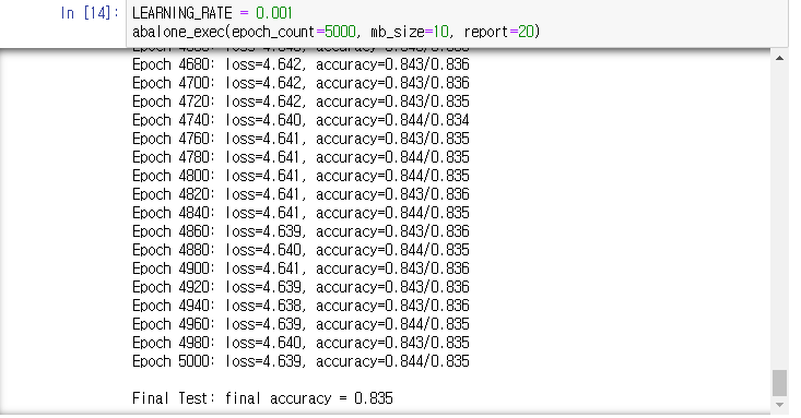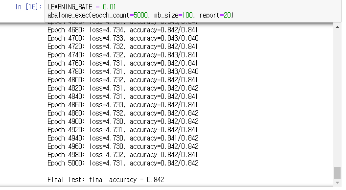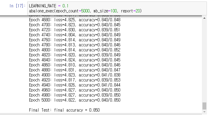 미니배치 100에 에폭5000, 학습률 0.1이 85%의 정확도로 제일 높았다. 이후 에폭만 증가시켜 학습을 다시 진행했지만 84퍼센트의 정확도로 감소하는 것으로 보아 오버피팅이 발생한 것으로 생각된다.
