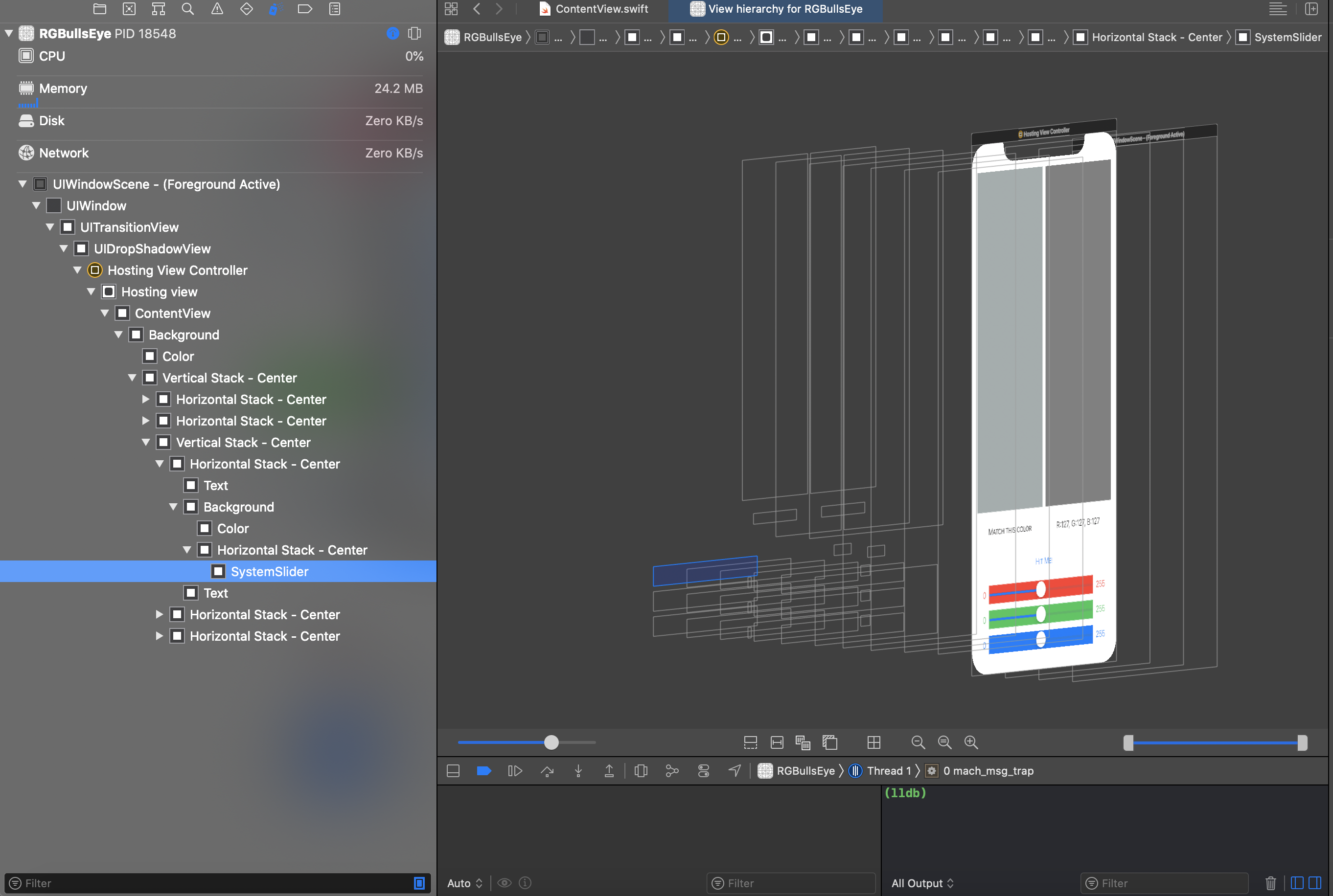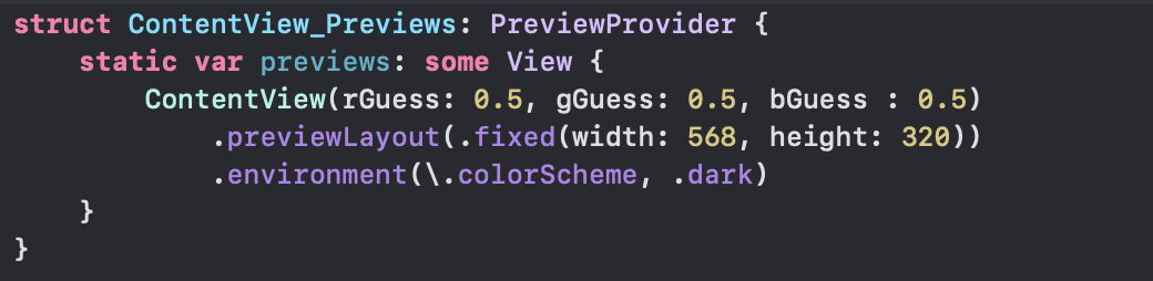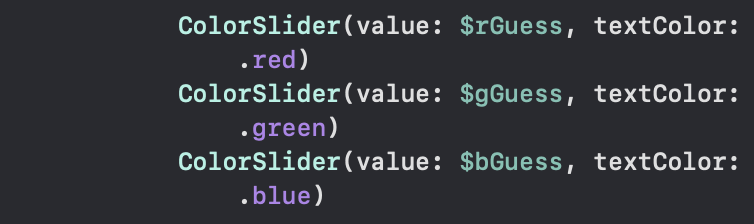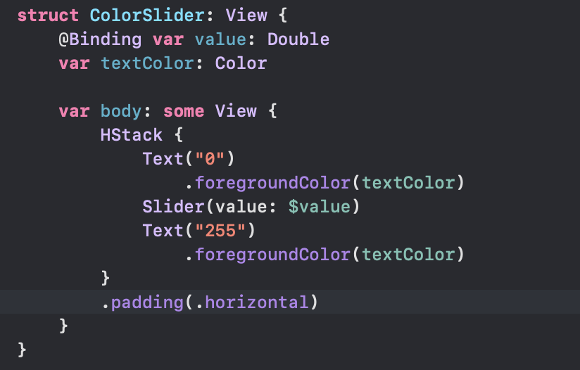 위 세개의 colorSlider는 logical unit이기 떄문에 상식적으로 각각의 ColorSlider 에 padding 을 주기 보단 unit 에 padding 을 주는 것이 맞다. 그러기 위해서 VStack 으로 감싸주고 해당 Container 인 VStack 에 padding 을 준다.