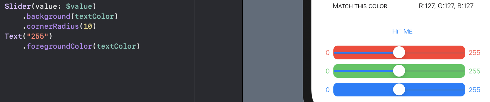 - Single source of truth: view 가 읽는 모든 데이터들은 진실의 근원이다,,,? view 에 의해 소유되거나 view 외부에 있거나. 그 진실의 근원이 어디에 있던지 너는 항상 단 하나의 진실의 근원을 가지고 있어야 한다. 이것이 바로 왜 @State 값을 ColorSlider 내부에 선언하지 않은 이유이다. 내부에 선언을 하게되면 duplicate 된 진실의 근원이 존재함으로 rValue를 계속 동기화 해줘야 한다. 그 대신에 @Binding 값을 통해 view 가 다른 뷰로 부터 온 @State 에 depend 하게 만들어 줬다.
