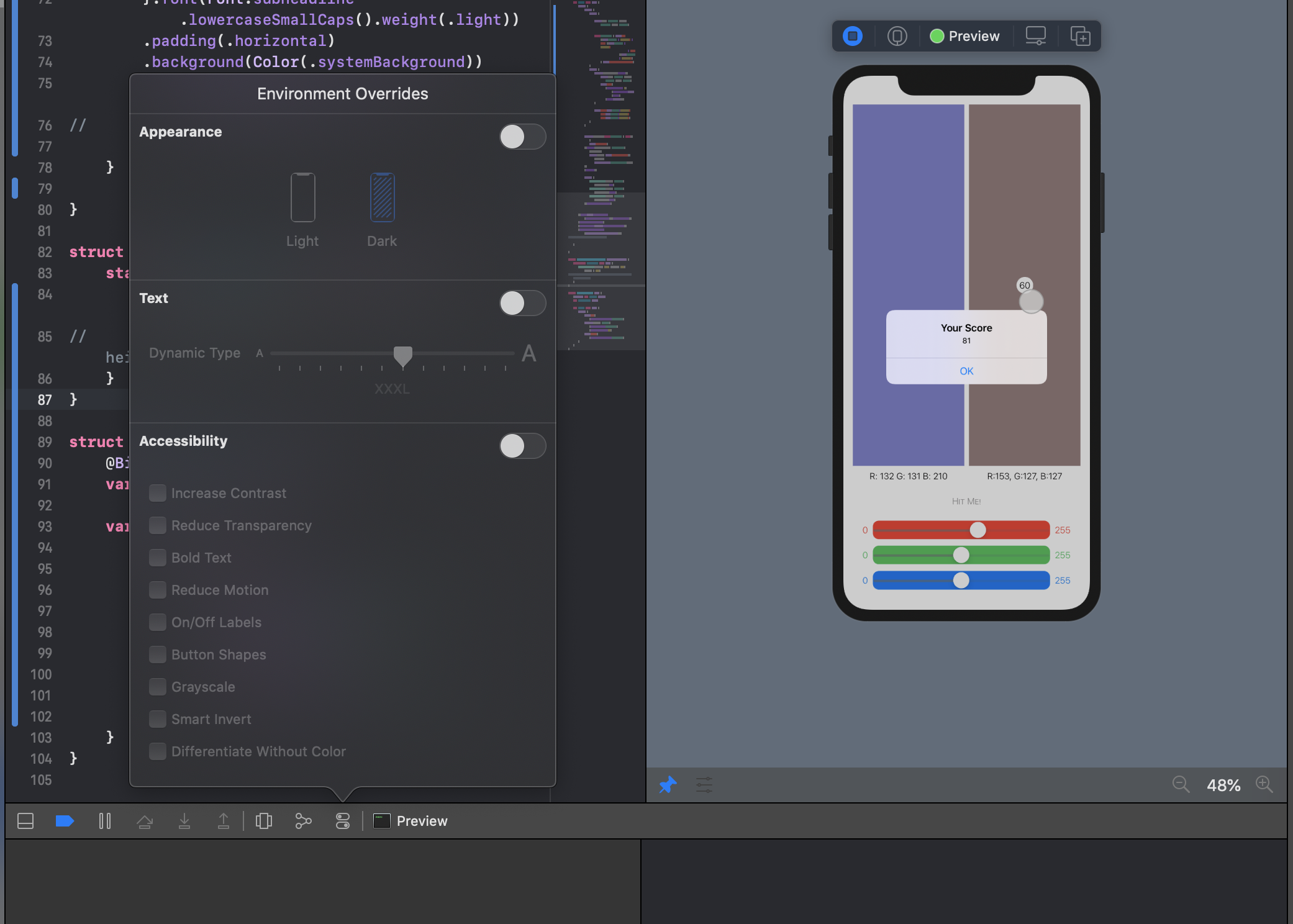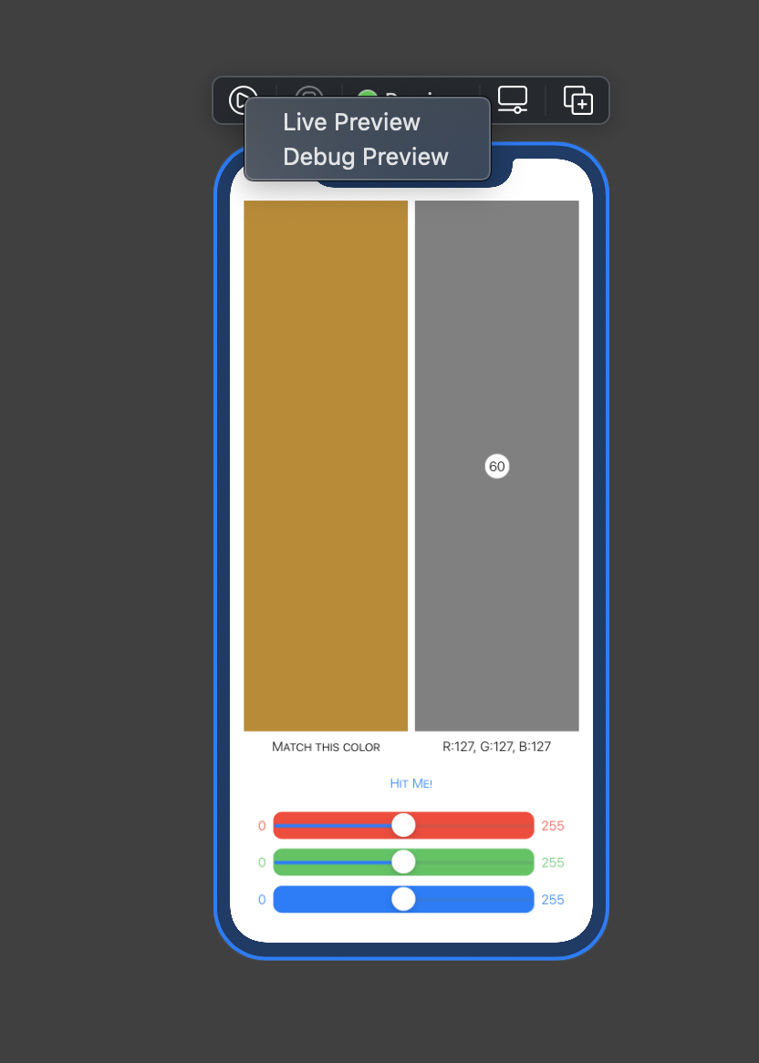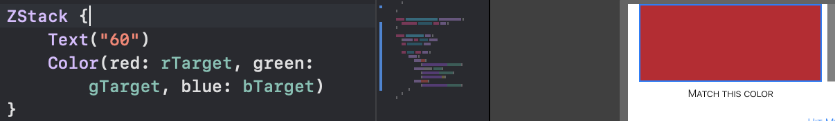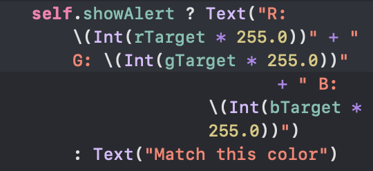 좀더 명시적으로도 가능하다. 예를들어 showAlert가 true, 즉 Hitme 로 정답을 점수를 계산해봤을 때 Match this Color 에 정답을 표시해주고 아닌 경우 원본 텍스트를 보여주는 코드를 작성할 수있다.
