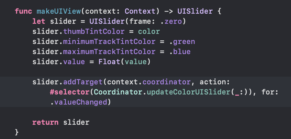 UISlider 값을 받기 위해 coordinator 는 UISlider control 이벤트인 valueChanged를 구현해야 한다. 해당 이벤트를 target-action 으로 parent view의 makeUIView(context:) 내에 명시해 준다.