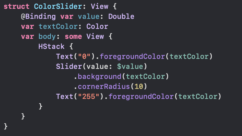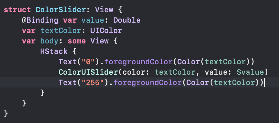 coordinator의 목적은 UISlider의 값을 ColorSlider프로퍼티 값에 전달하는 것 이다. ContentView에 있는 @State 변수를 참조하는 것 인데 바인딩 됨으로써 UISlider 값이 ContentView를 효과적으로 업데이트 시킬 수 있는 것 이다.