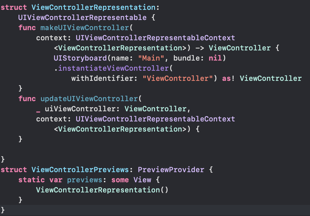 make와 update 메소드를 필요로 한다. makeUIViewController(context:)의 경우 ViewController 를 지정된 Storyboard에서 인스턴스화 시키켜준다. (그래서 storyboard ID 가 필요하다)