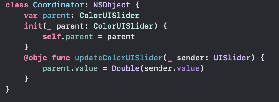 이로써 coordinator 에세 parent ColorSlider(underlying UIView 는 UISlider) 를 연결해 주었다.