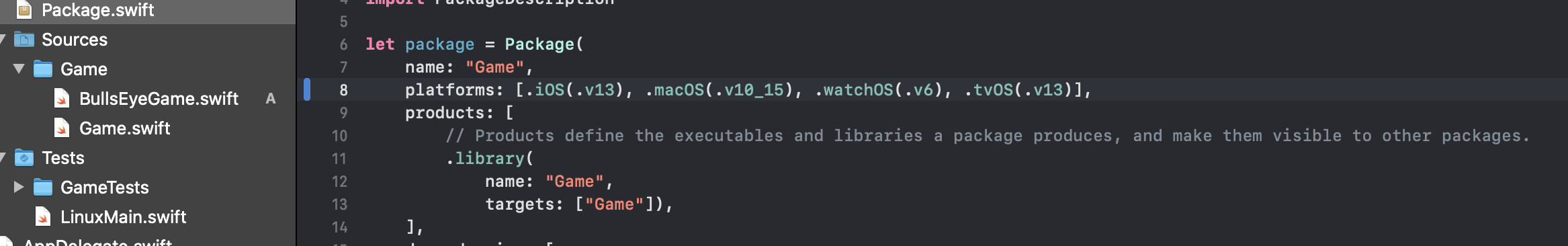 - BullsEyeGame.swift 를 Game 패키지의 source->game 에 옮겨준다.