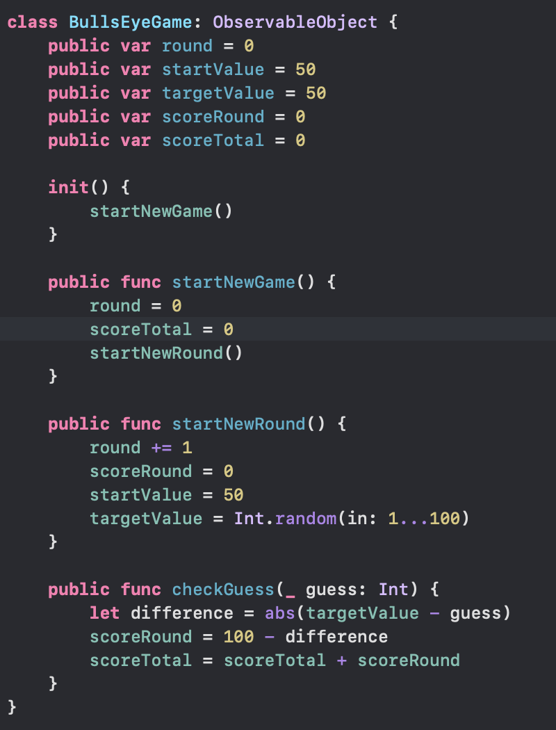 - BullsEyeGame.swift 는 더이상 BullsEye 그룹에 속하지 않기 때문에 모든 변수랑 함수를 public 으로 선언한다.
