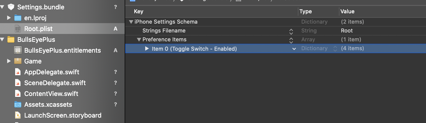 만들어진 Root.plist 에서 Toggle Switch 빼고 삭제한다.