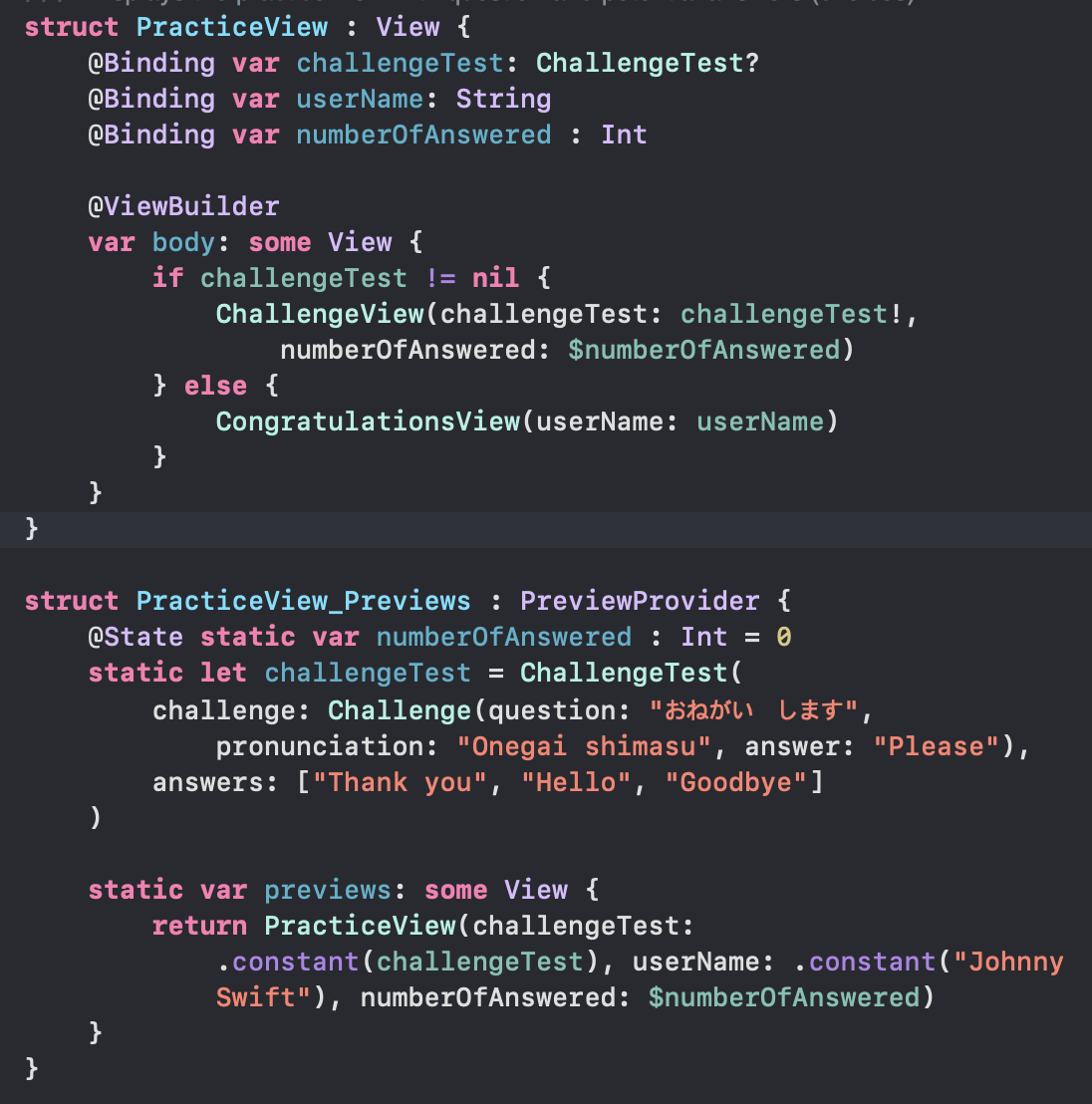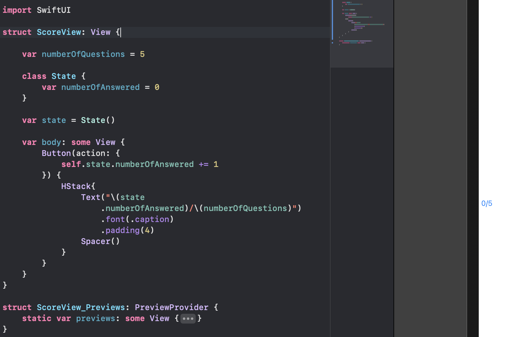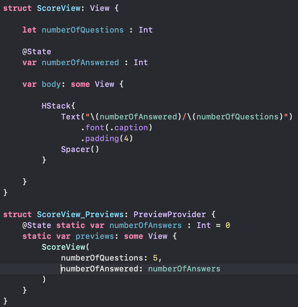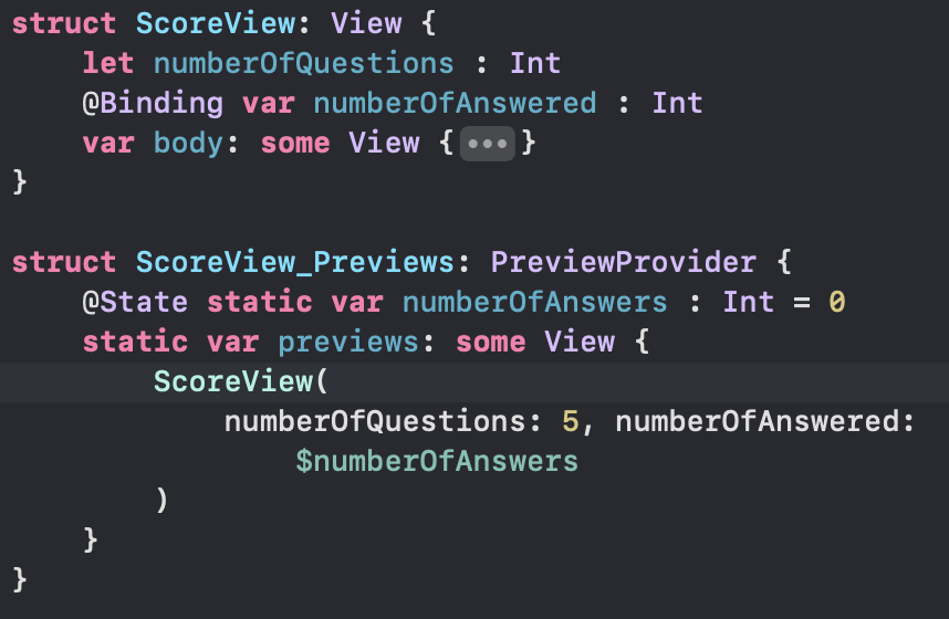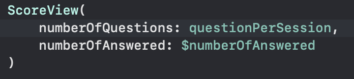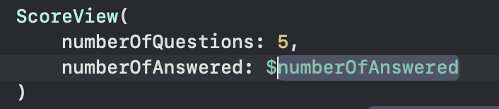 1번째 문제는 Practice/ScoreView.swift를 열어서 @State 로 되있는 numberOfAnswered를 @Binding 으로 고쳐서 전달한다. preview 에도 argument 를 전달한다.
