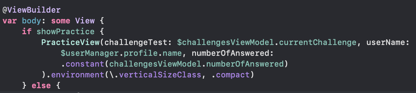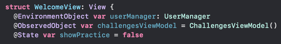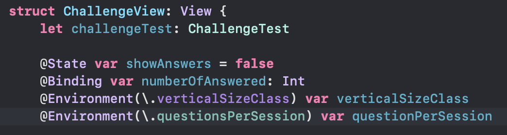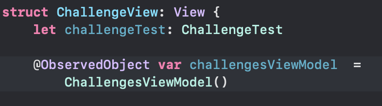- @EnvironmentObject attribute 를 사용함으로써 해당 프로퍼티가 view environment 에서 ChallengesViewModel 의 instance를 가져온다라고 명시해준다.