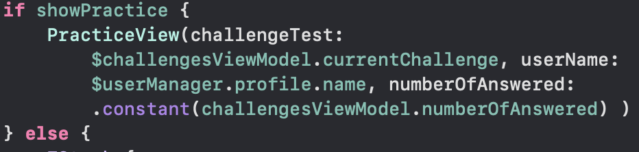 ScoreView를 보면 맞춰야할 문제 수가 ChallengeViewModel 에 있는 값이 아닌 constant 로 전달되는 걸 볼 수 있다.