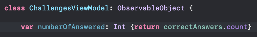 WelcomeView 에서 맞춘 갯수를 보여줘야 하기 때문에 ChallengeViewModel 에 맞춘 갯수를 반환하는 computed property를 추가한다.