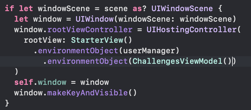 일단 rootView 에 주입하기 위해 SceneDelegate.swift 에서 enviroment object 를 넣어주자