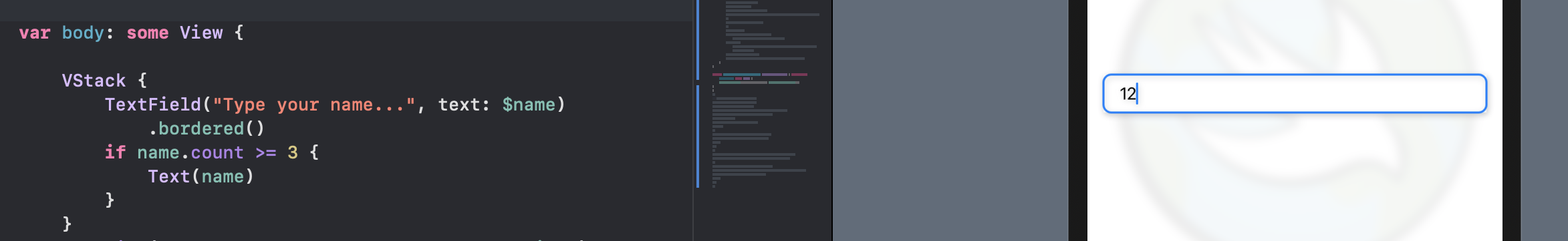 이 경우(두 값을 동기화 하는것) 는 간단한 예시기 때문에 name을 computed property 로 만들어 text field 의 text property 의 proxy(중계자) 역할을 하게 만들면 해결된다.