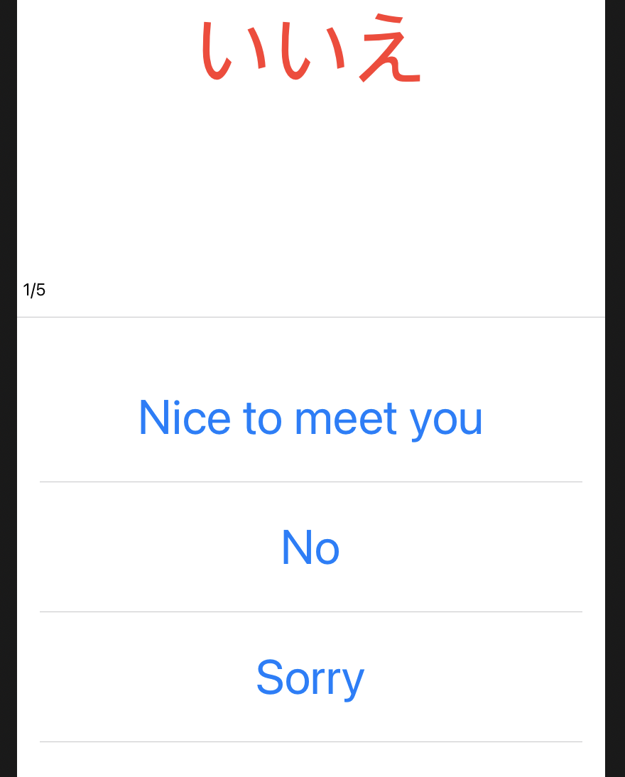 Kuchi 앱에서 이전까지 단어가 나오고 3개의 보기중 정답을 선택하고 정답을 확인 하는 alert 까지 구현해 보았다.