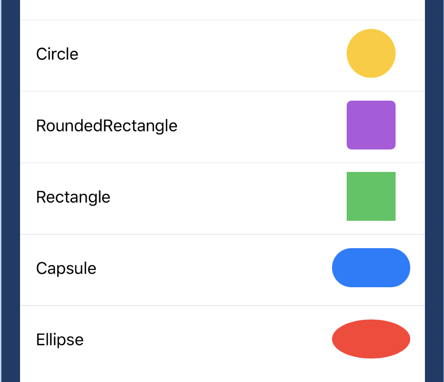 기본적으로 Rectangle, Circle, Ellipse, RoundedRectangle, Capsule 이 있다. - 디폴트로 Shape 에는 foreground color 가 입혀진다.