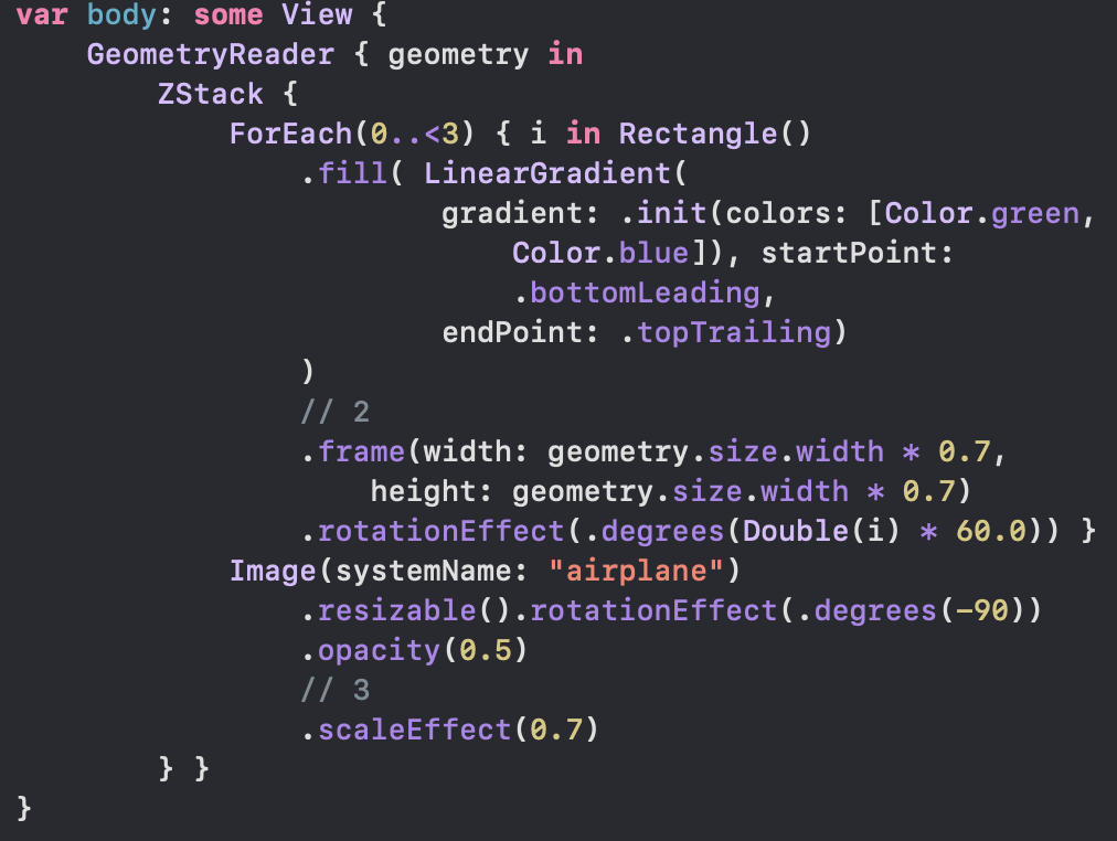 - GeometryReader container는 내부 view 의 size 와 shape 를 가져올 수 있게 하여 constants에 의존하지 않고 코드를 작성할 수 있게 한다.