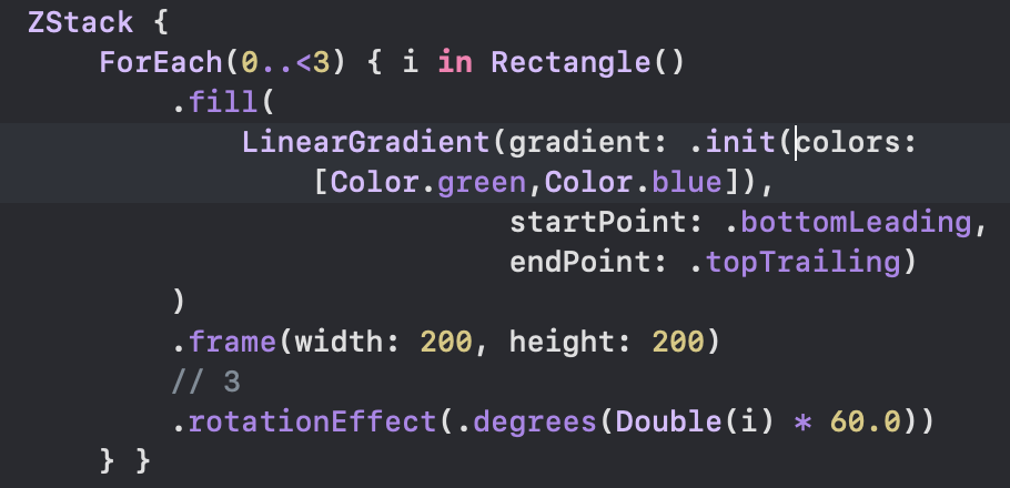 - 3개의 사각형을 담을 ZStack을 만든다. ZStack은 content를 배치가고 양 축에 정렬한다.