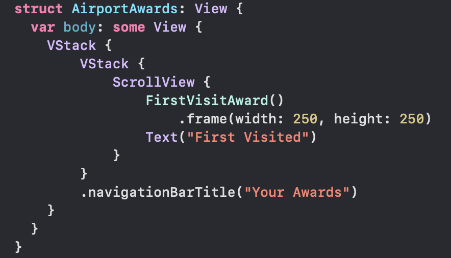 뱃지를 그릴 FirstVisitAward.swift 파일을 만들고 AirportAwards.swift 에 FirstVisitAward를 scrollView 안에 넣어준다.