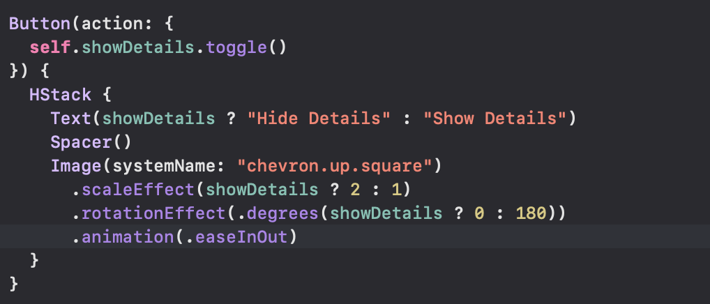 scaleEffect () 및 rotationEffect () 메서드 사이에 .animation (nil)을 추가하면 화살표가 커진다음 rotating animation이 적용되는 걸 볼 수 있다.