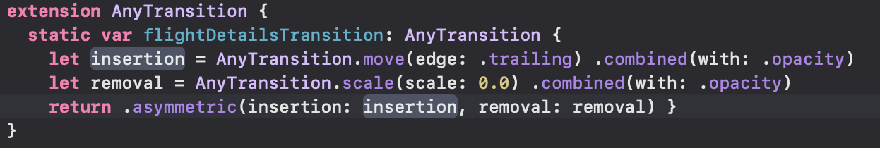 이렇게 view code 에 animation을 넣지말고 따로 빼주어 복잡한 animation의 가독성을 높여줄 수 있다.