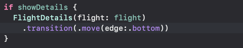 transition은 animation type 이기 때문에 state 주위에 withAnimation() 를 지정해야 한다. 그렇지 않으면 SwiftUI는 transition을 표시하지 않는다.