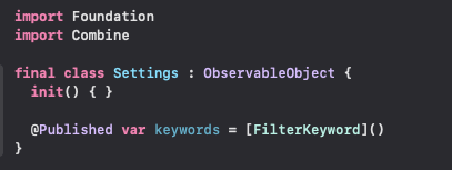 이제 Settings.keywords 를 ReaderViewModel.filter 에 연동시켜줄 수 있다.