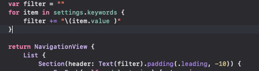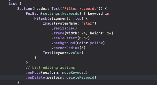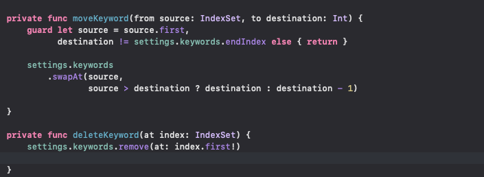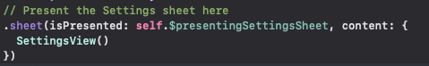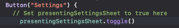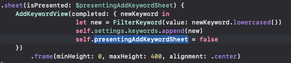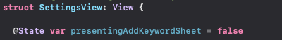 SettingsView.Swift 파일을 보면 presentingAddKeywordSheet 라는 Bool 변수를 볼 수 있습니다.