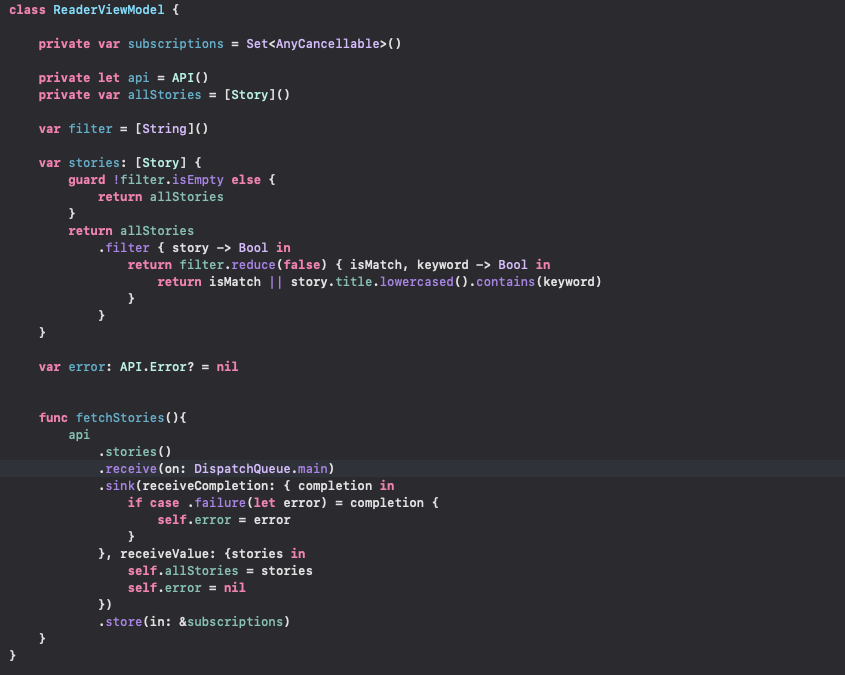 ObservableObject/ObservedObject 방식이 아니라 그냥 하나의 publisher 를 구독해서 값을 받고 싶을 땐 새로운 ReaderViewModel과 같이 새로운 타입을 만드는게 아니라 onReceive(_)라는 modifier를 사용한다. 이것은 view code 에서 publisher에 직접적으로 구독할 수 있게 해준다.
