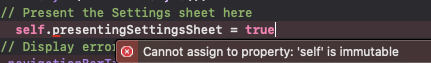 일단 @State attribute 가 presentingSettingsSheet 에 추가되면 컴파일러는 non-mutating context에서 해당 프로퍼티를 수정할 수 있는걸 알기 때문에 에러는 사라집니다.