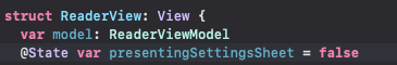 ReaderView 에서 그냥 변수였던 var presentingSettingsSheet에 @State property wrapper 를 달아줍니다.