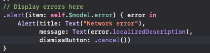 alert(item:) modifier는 item 이라는 optional 값에 바인딩 된다. item 이 nil 이 아닌 값을 방출하게 되면 alert view 가 presnet 된다.