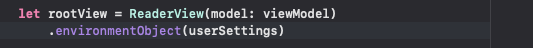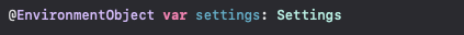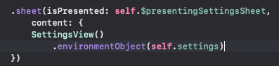 그리고 SettingsView()에 environmentObject(self.settings)로 직접 environment object를 주입해준다.