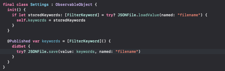 JSONFile 이라는 helper type 에서 loadValue(named:) 와 save(value:named:) 메소드를 이용한다.