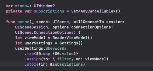 Settings instance 를 sceneDelegate에서 생성해 ReaderViewModel 에 바인딩 시켜준다.
