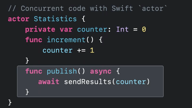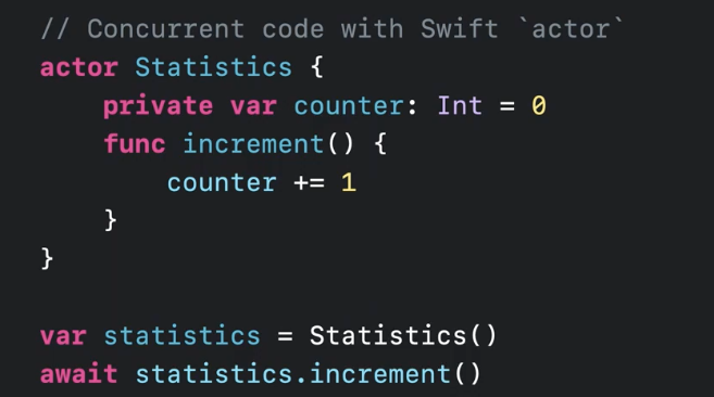 actor 는 asyc/await 과 함께 사용해서 네트워크 결과 올때까지 기다리게 할 수 있으면서 다른 쓰레드가 이 increment 에도 접근 가능하게 하면서도 data 오염의 위험도 없게 해준다.