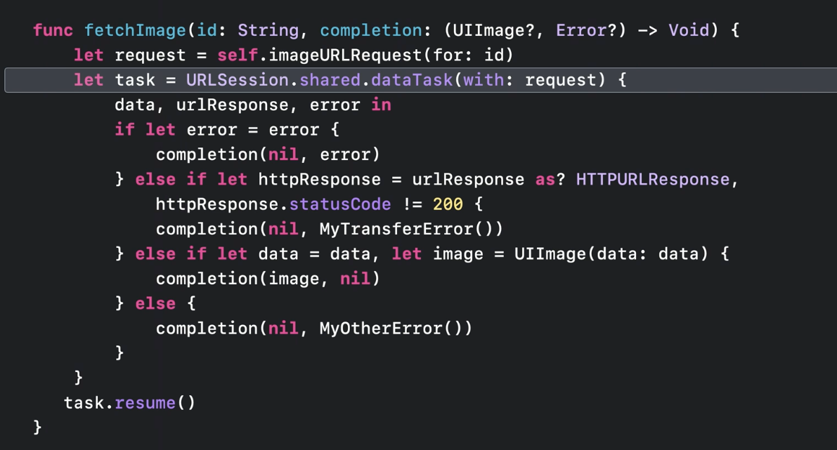 태스크를 만들고 task.resume()를 통해 일단 리턴해줌. 그리고 네트워킹이 끝나면 completion handler를 통해 끝남