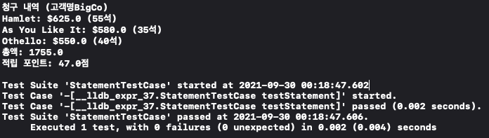 let answer: String = "청구 내역 (고객명BigCo)\nHamlet: $625.0 (55석)\nAs You Like It: $580.0 (35석)\nOthello: $550.0 (40석)\n총액: 1755.0\n적립 포인트: 47.0점\n"